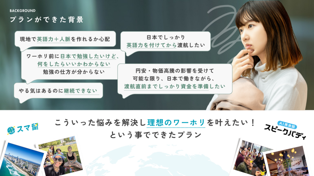 こうした背景を受け、スマ留はワーキングホリデー希望者一人ひとりの状況や課題に寄り添った英語学習支援の必要性を強く認識しました。そこで英語コーチング分野で実績を持つスピークバディと協業し、ワーキングホリデー前に特化した英語コーチングサービスの提供に至りました。