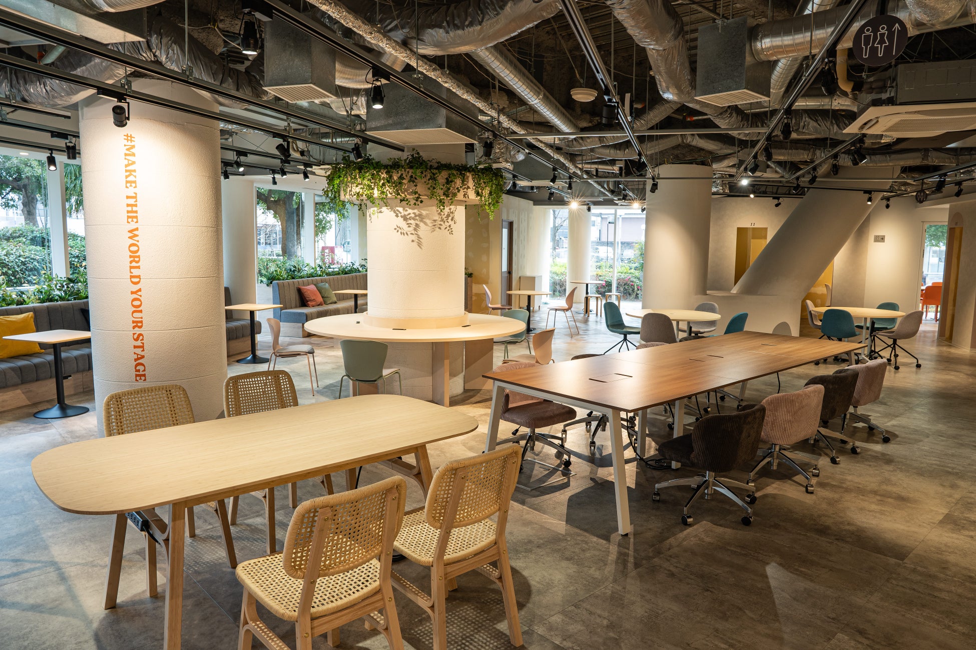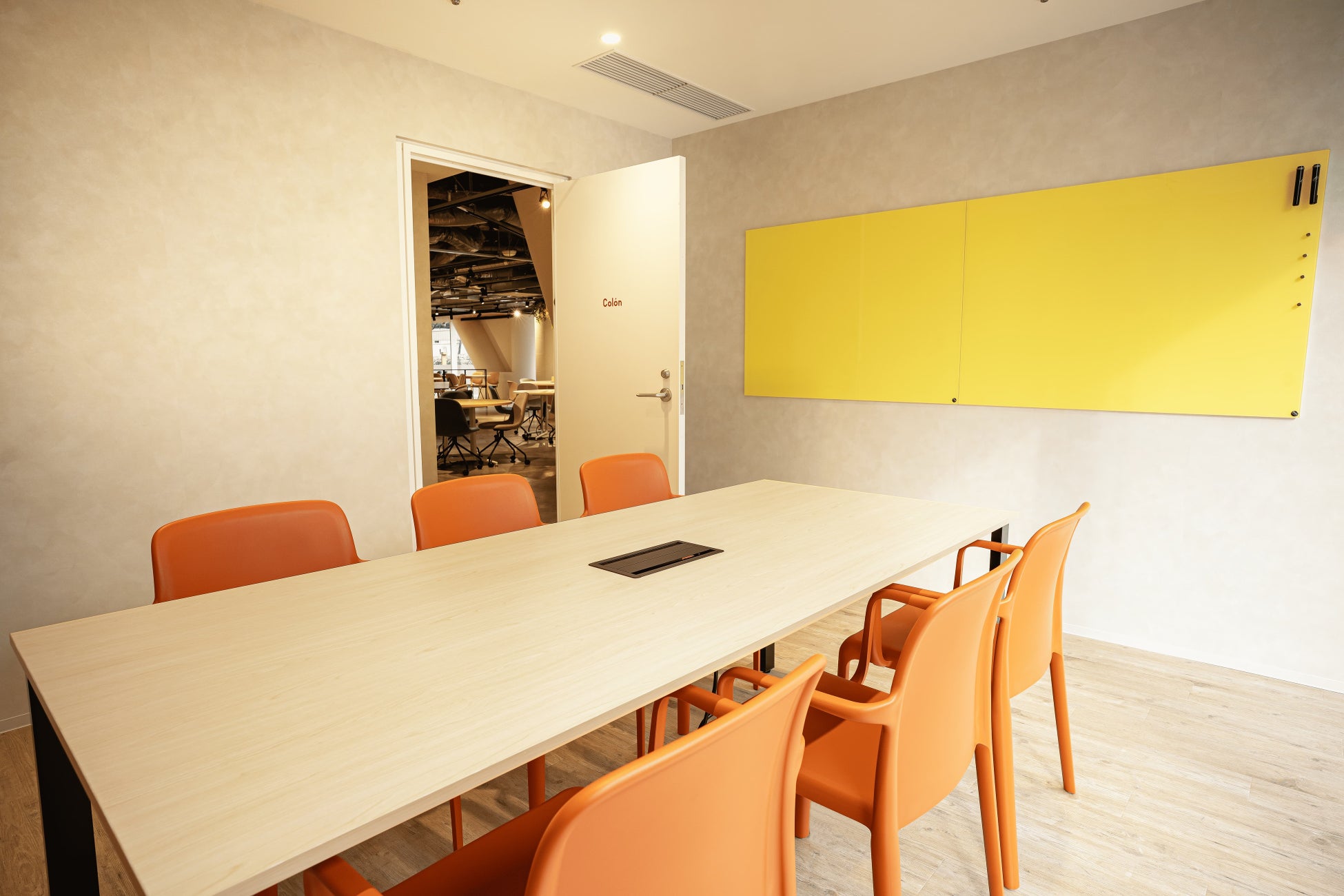 リアブロードをイメージしたオレンジや黄色をニュアンスカラーで取り入れており、”リアブロードらしさ”を残しながらも落ち着いた空間になるよう設計いたしました。サロン内には異なる色や形のデスク・チェアを設置し、その日の気分に合わせて働くことができる空間となっております。