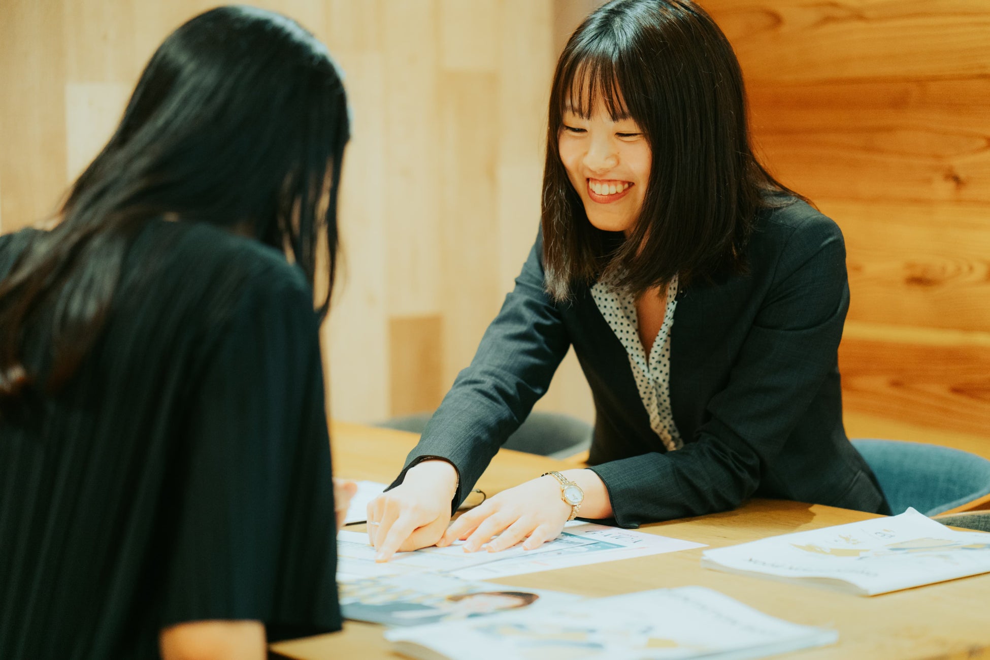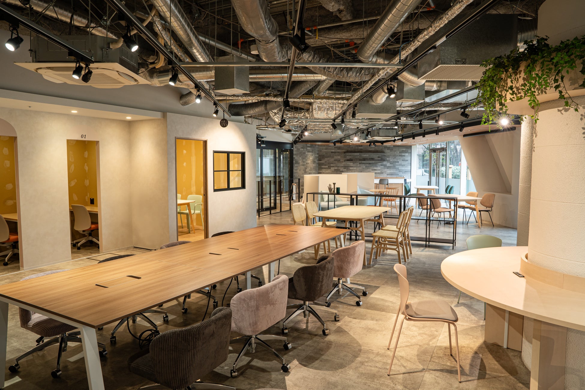 仕切りのないオープンスペースは、自然光が入るガラス窓が設置されており、開放感が溢れる明るい空間となっております。留学カウンセリングでお越しいただくお客様や、サロンで働く社員が心地よく過ごせるような柔らかい色合いや丸みのあるデザインが特徴です。サロン内に個室のオンラインスペースもあるため、遠方のお客様にもオンラインで繋いでご案内することができます。