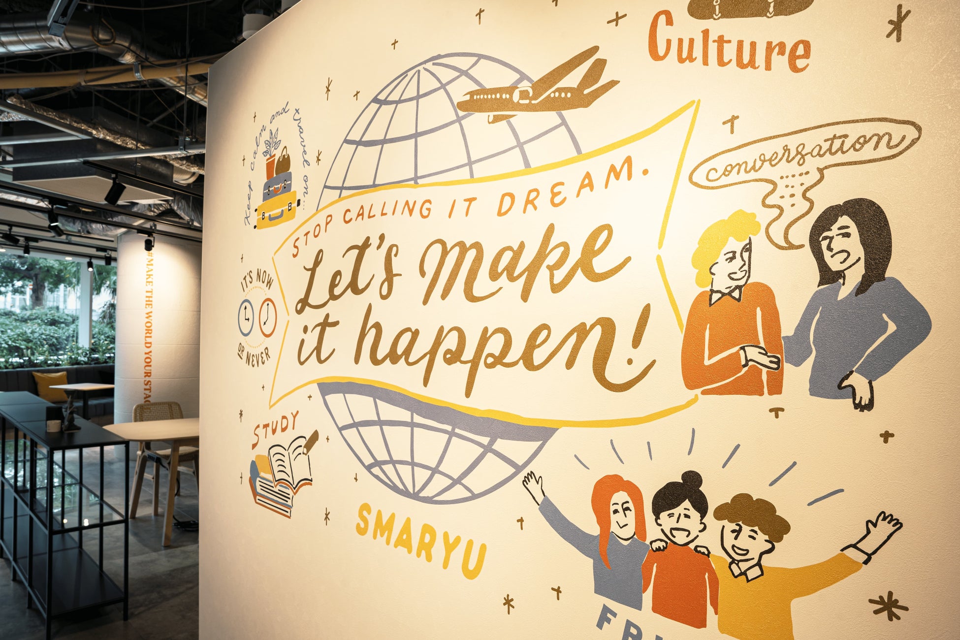 エントランスには、”手描きグラフィックアーティスト”として第一線を進み続けるCHALKBOY(チョークボーイ)さんこだわりのカラフルな壁アートを設置。留学への一歩を踏み出す方を応援します。